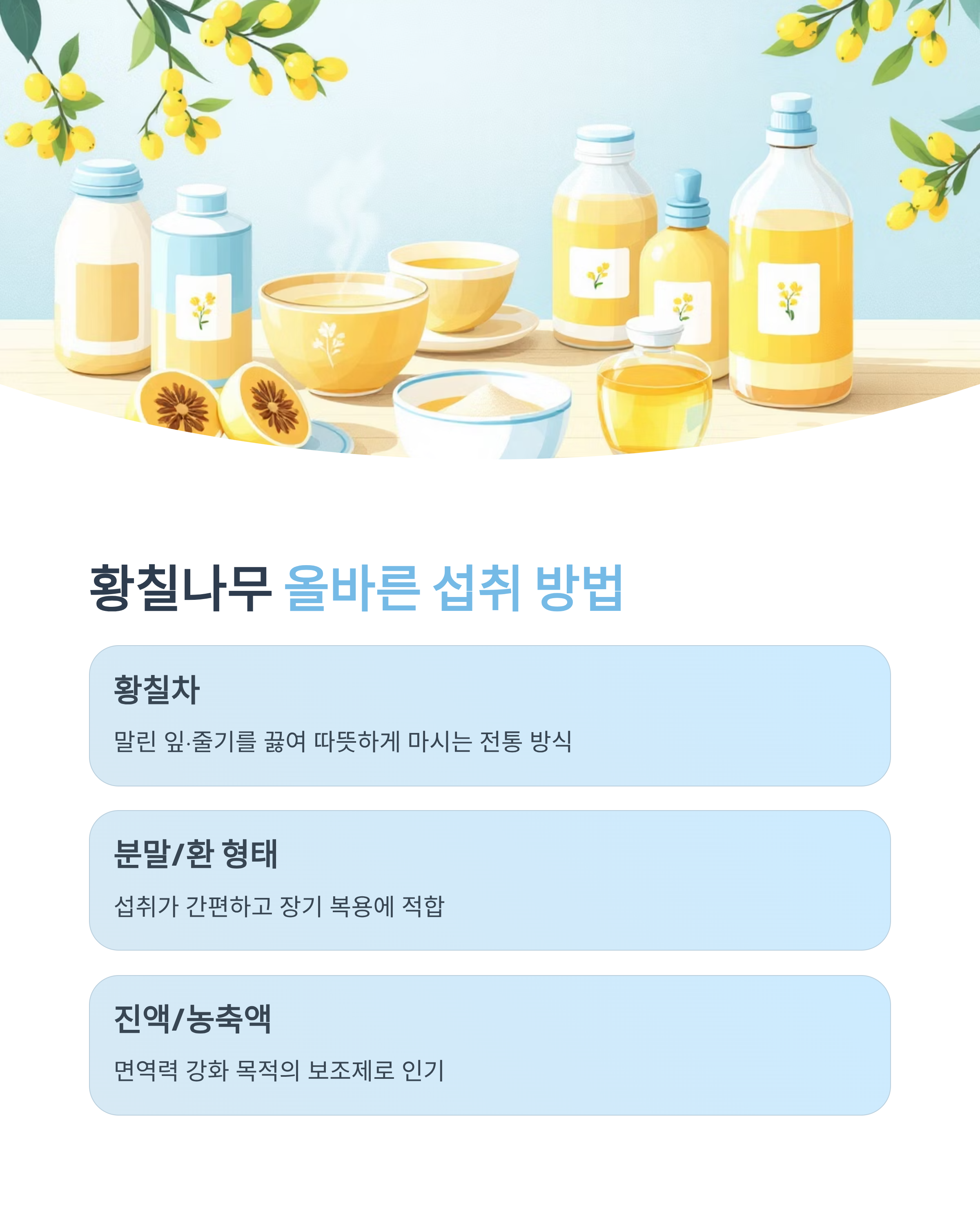 - 황칠차: 말린 잎·줄기를 끓여 따뜻하게 마시는 전통 방식
