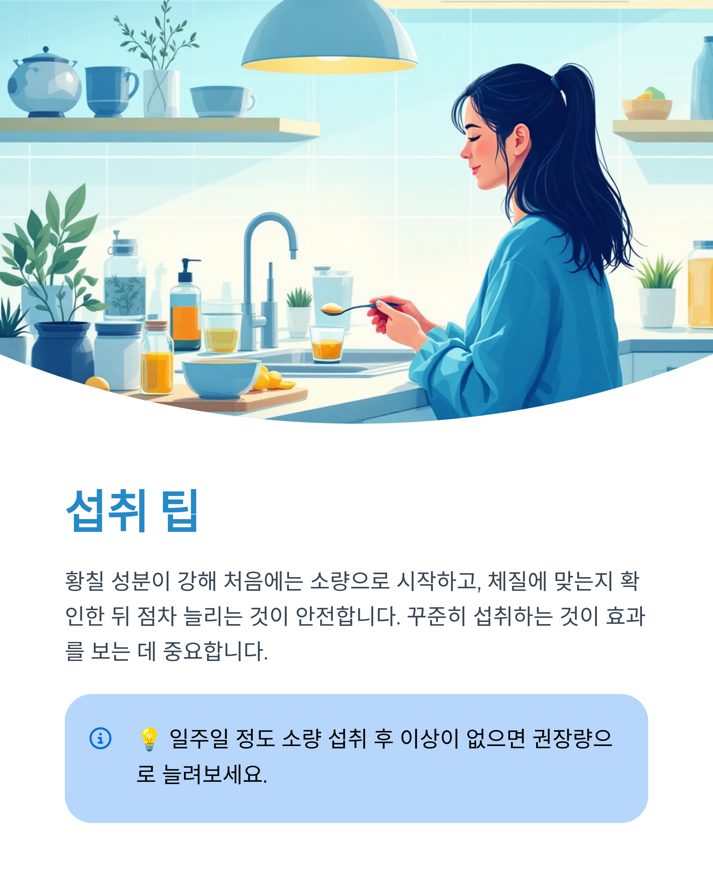 - 건강보조제로 활용하되, 전문가와 상담 후 꾸준히 섭취하는 것이 가장 좋습니다.
