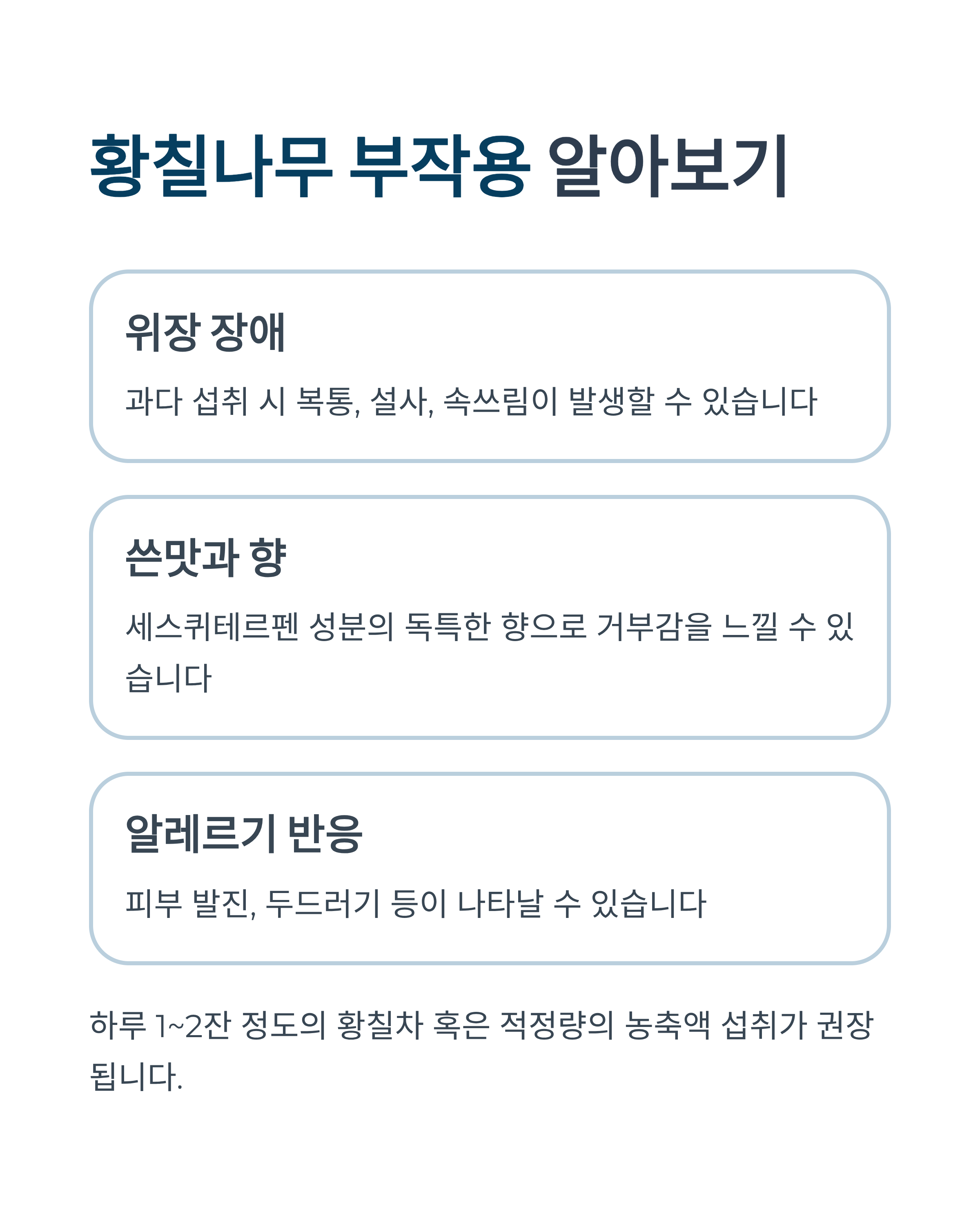 - 위장 장애: 과다 섭취 시 복통, 설사, 속쓰림 유발