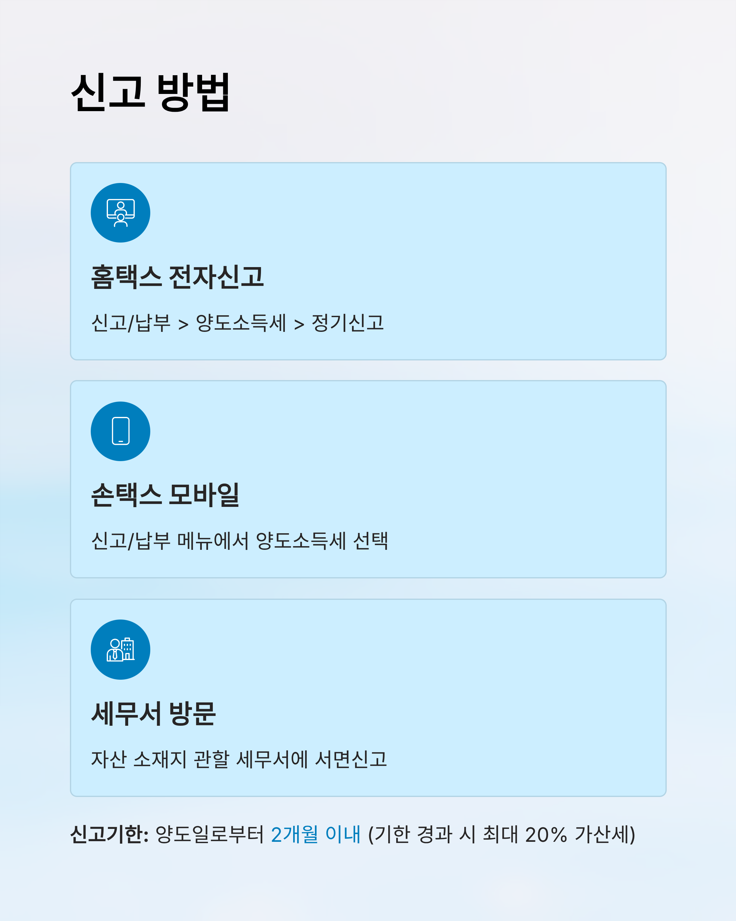 - 양도일로부터 2개월 이내(기한 경과 시 무신고가산세 최대 20% 등 불이익)