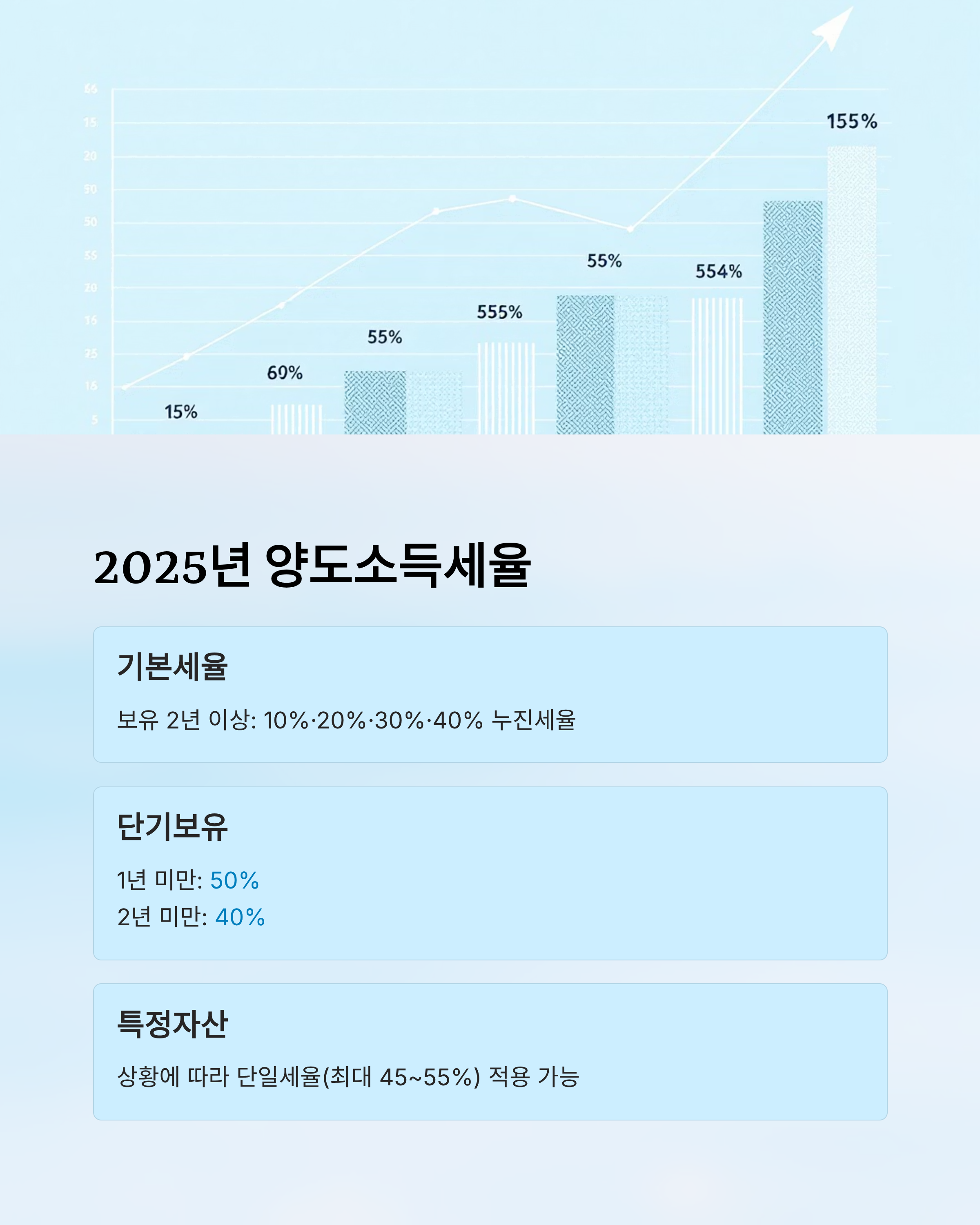 - 2025 세율: 2년 이상 보유 누진세율(10·20·30·40%), 단기보유 40~50%