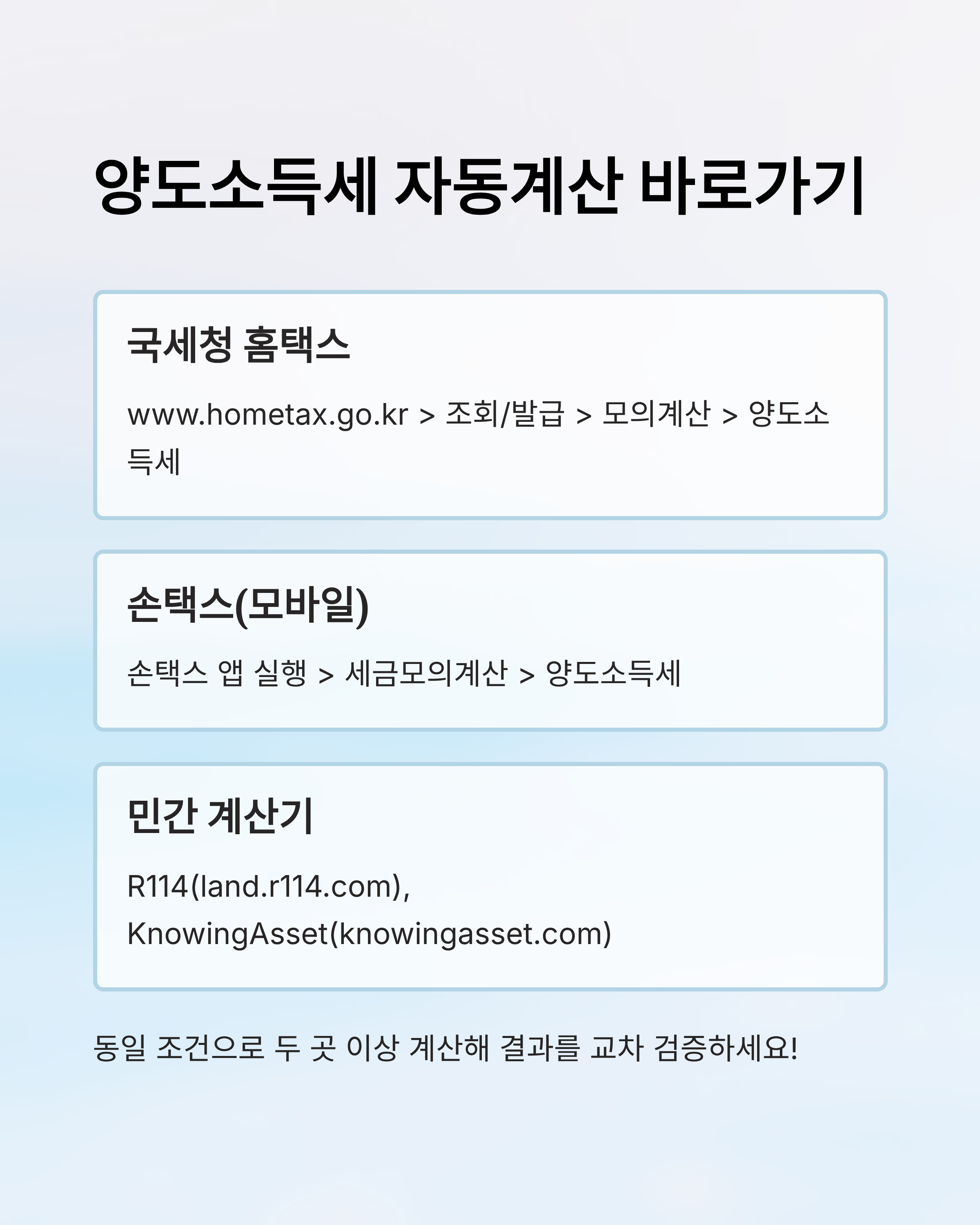 - 국세청 홈택스 세금모의계산: www.hometax.go.kr > 조회/발급 > 모의계산 > 양도소득세