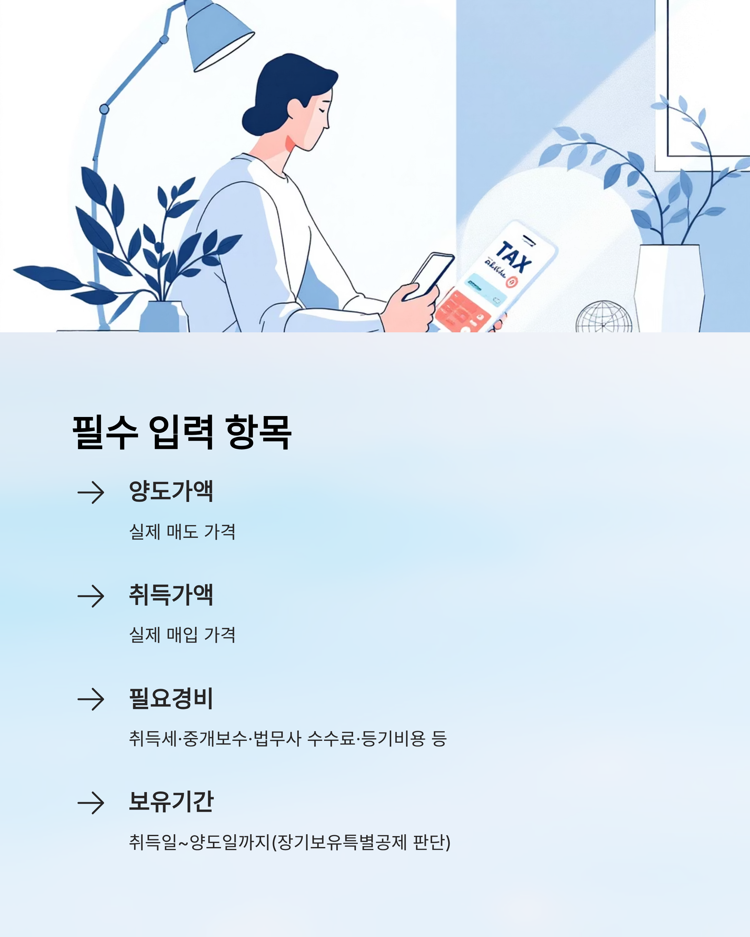 - 필요경비: 취득세·중개보수·법무사 수수료·등기비용 등 증빙 가능한 비용