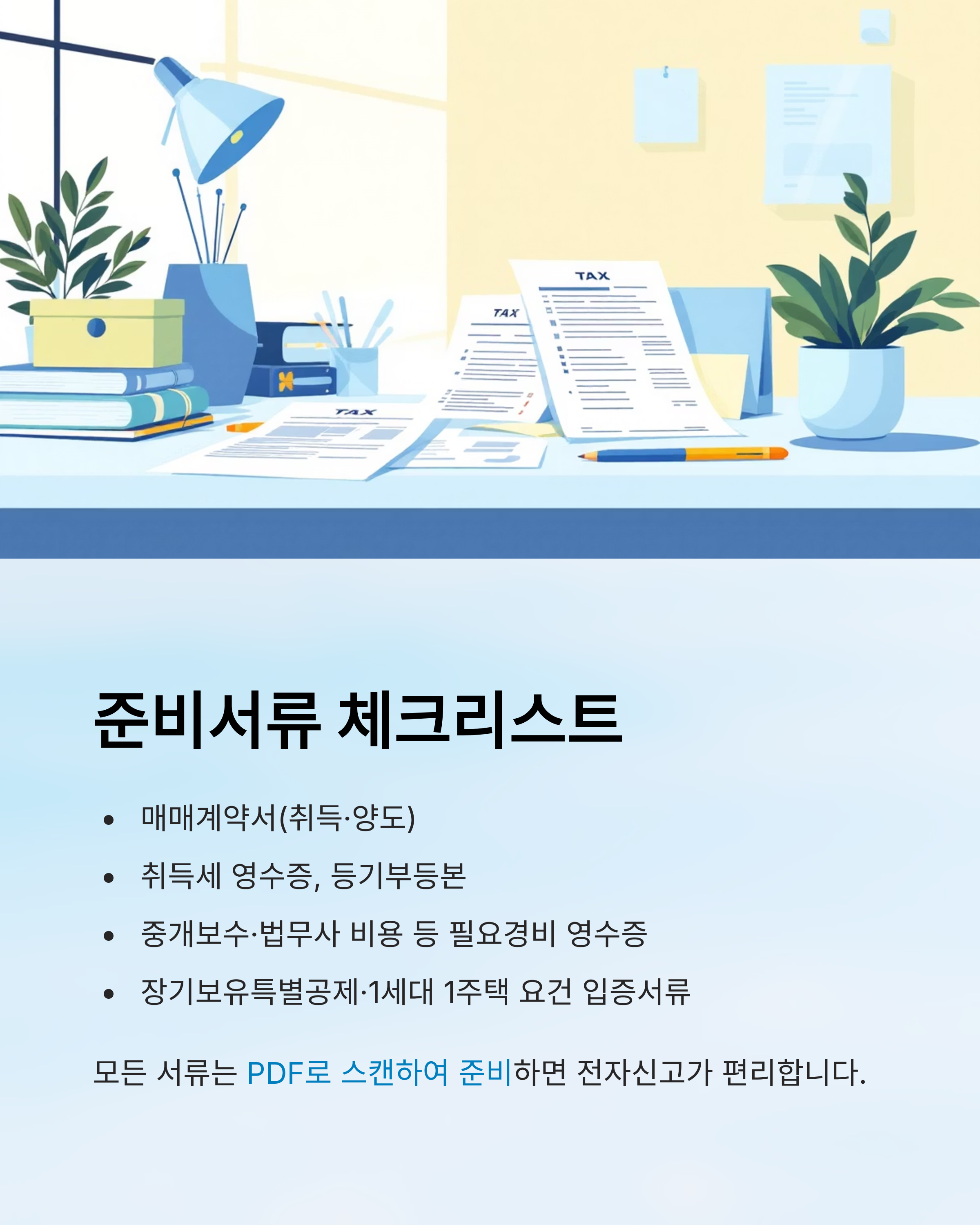 - 필요경비: 취득세, 중개보수, 인지세, 법무사 수수료 등 증빙 필수