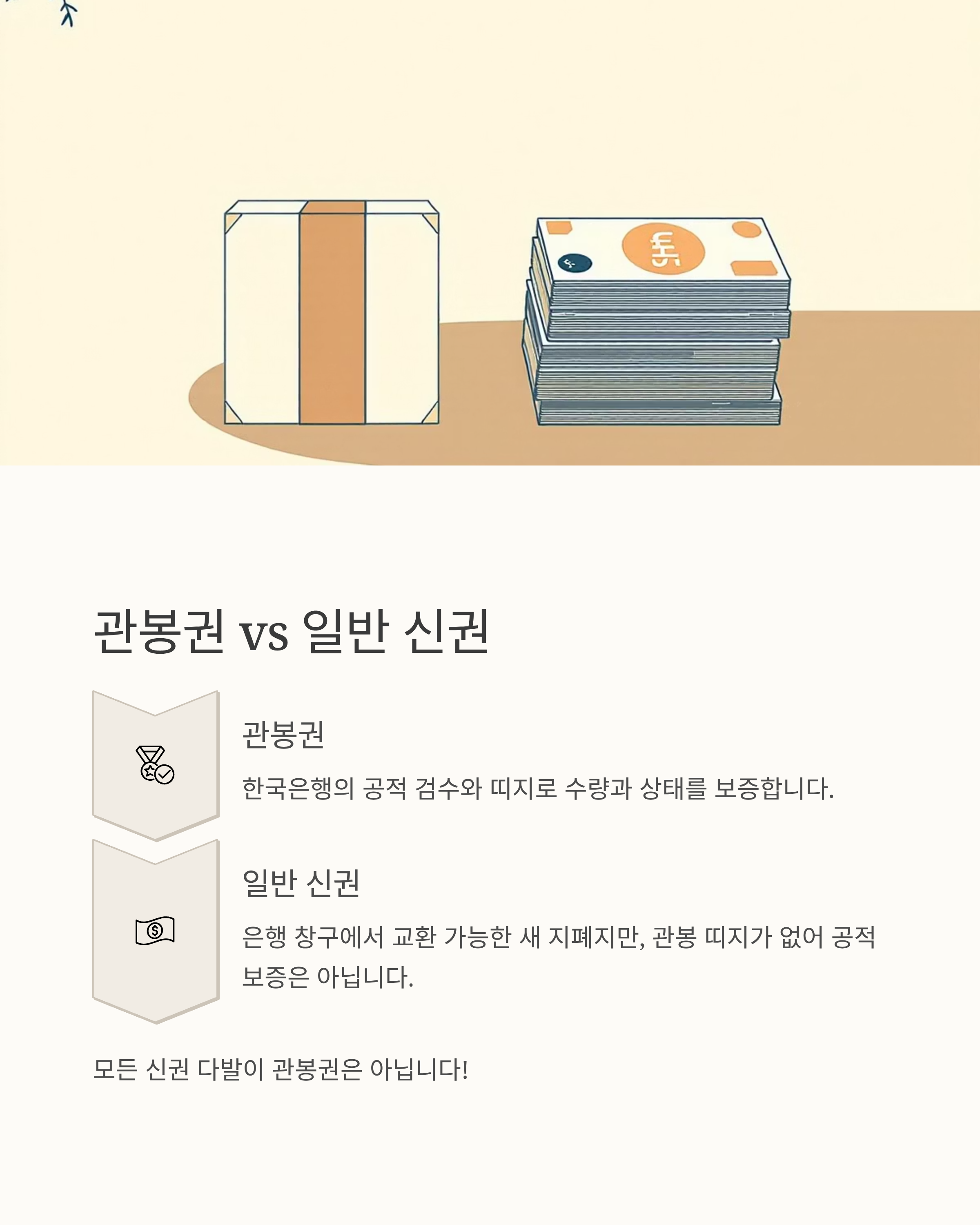 요약: 모든 신권 다발이 관봉권은 아닙니다. 관봉권은 ‘공적 검수+띠지’가 핵심이며, 이 요소가 관봉권의 신뢰도와 거래 편의성을 좌우합니다.