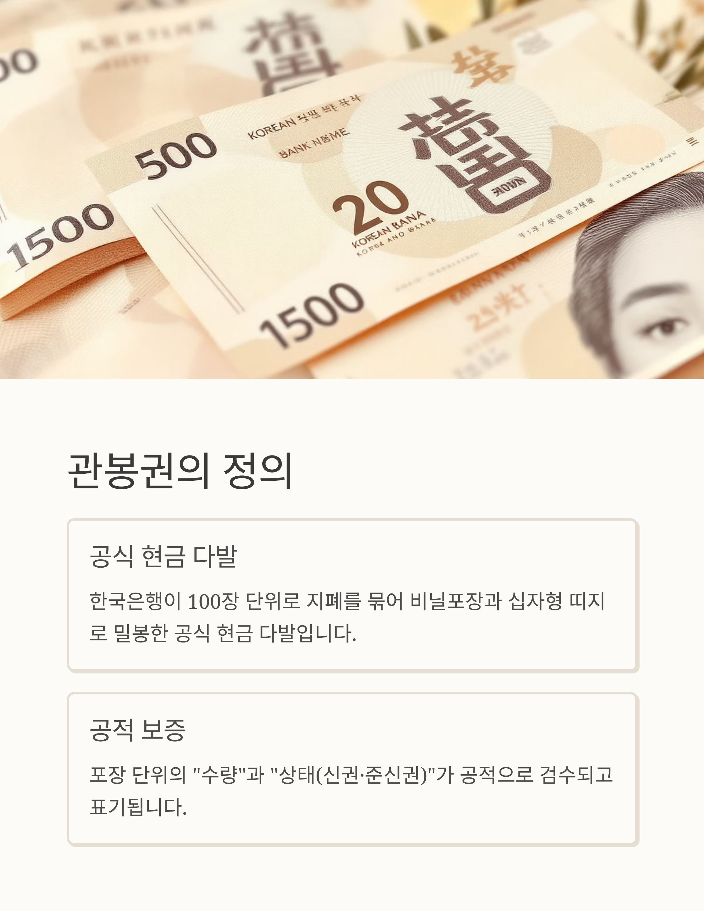 - 관봉권: 한국은행(및 위탁기관) 수량·상태 보증 하에 비닐+띠지로 봉인된 공식 지폐 다발