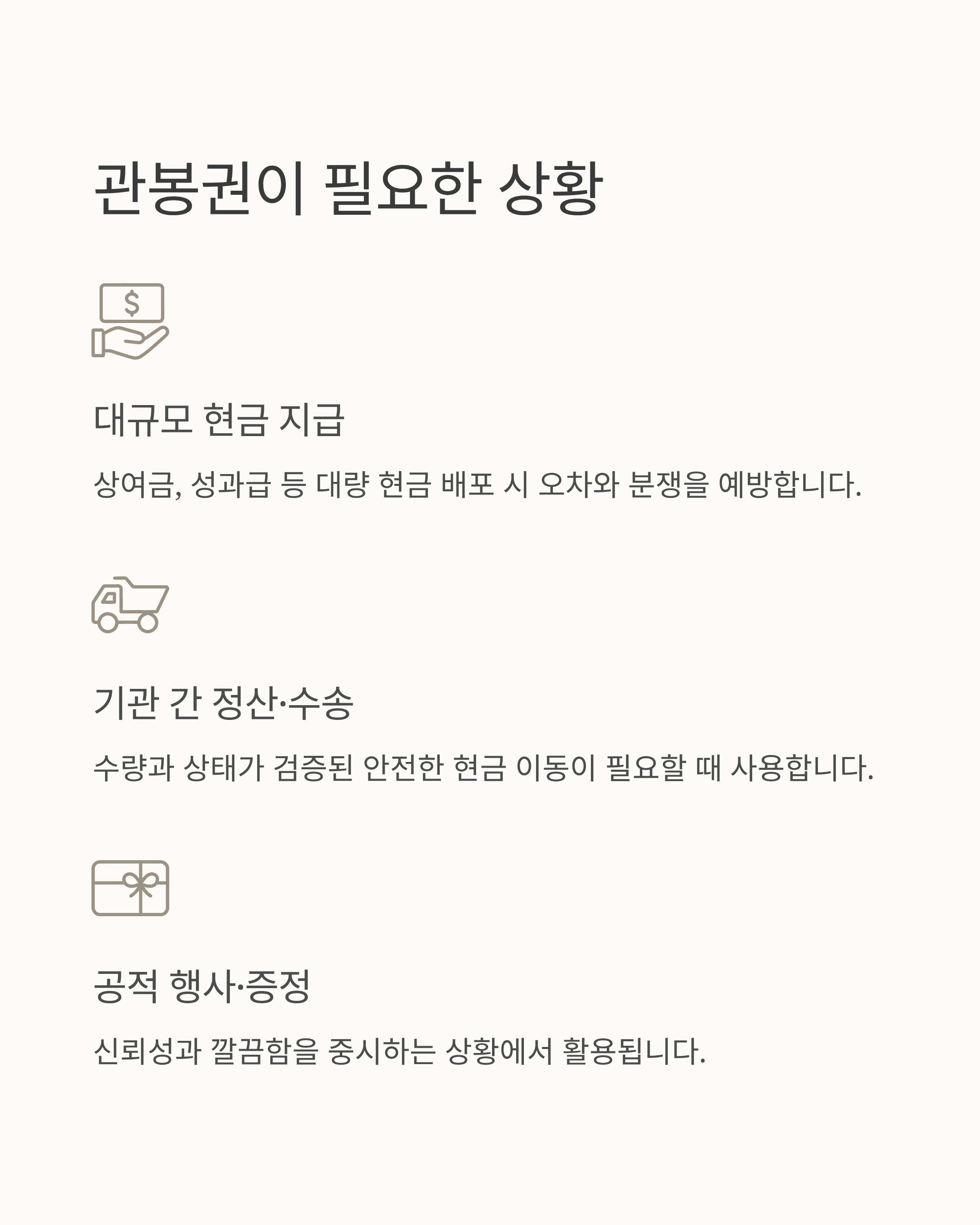 - 대규모 현금 지급: 상여·성과급 등 대량 현금 배포 시 오차·분쟁 예방.
