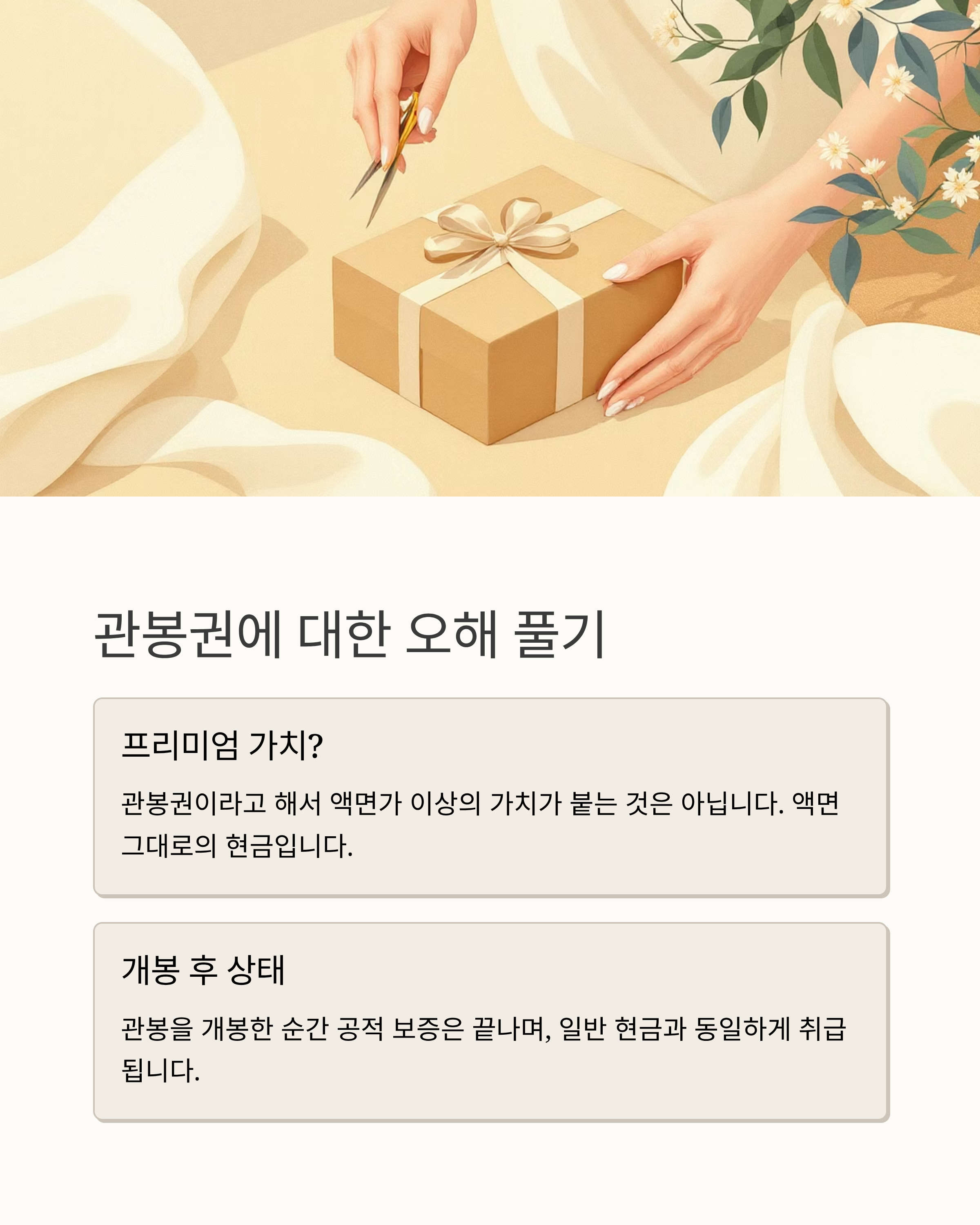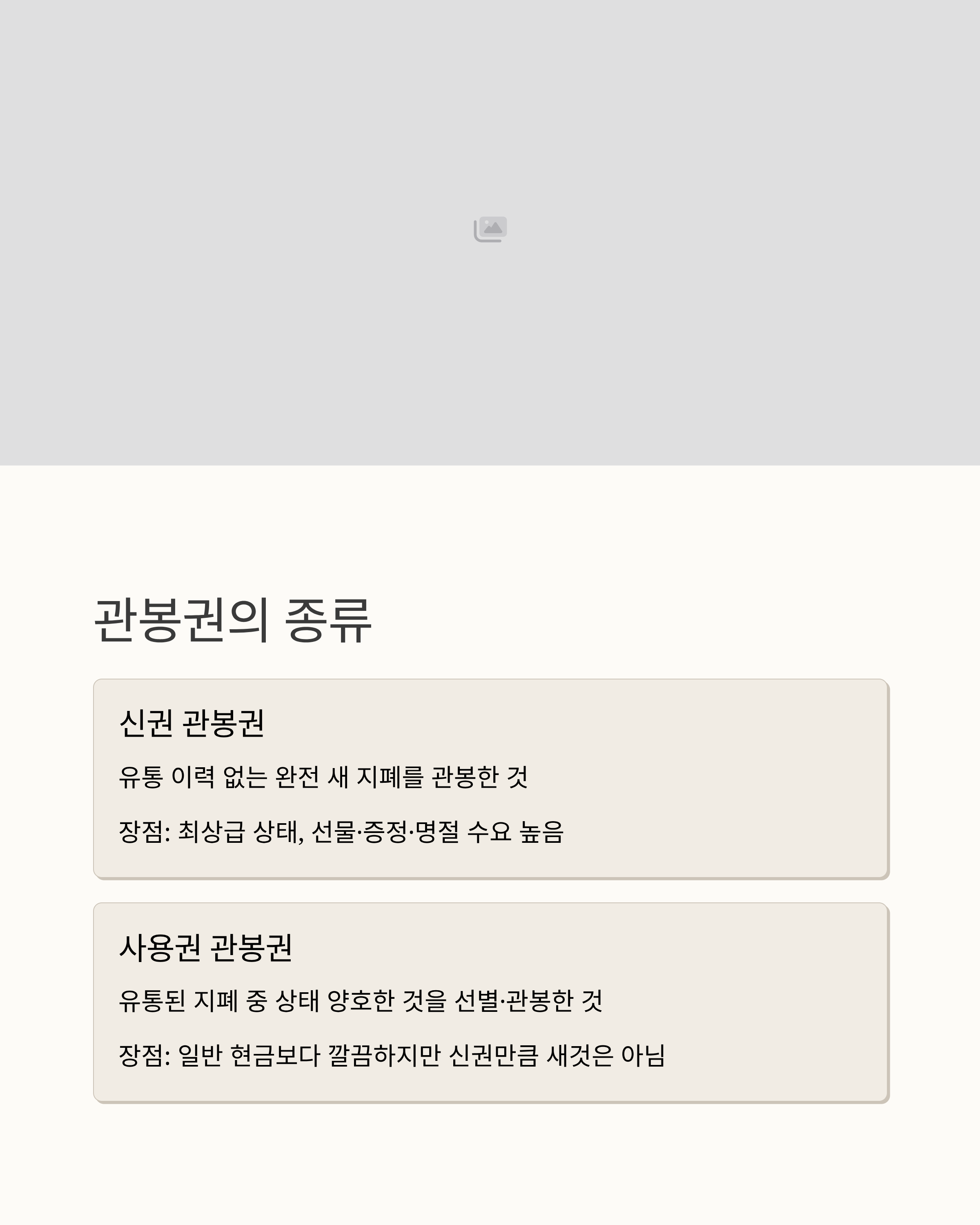 | 신권 관봉권 | 유통 이력 없는 완전 새 지폐를 관봉 | 최상급 | 선물·증정·명절 수요 높음 | 수량·상태 보증, 띠지 훼손 주의 |