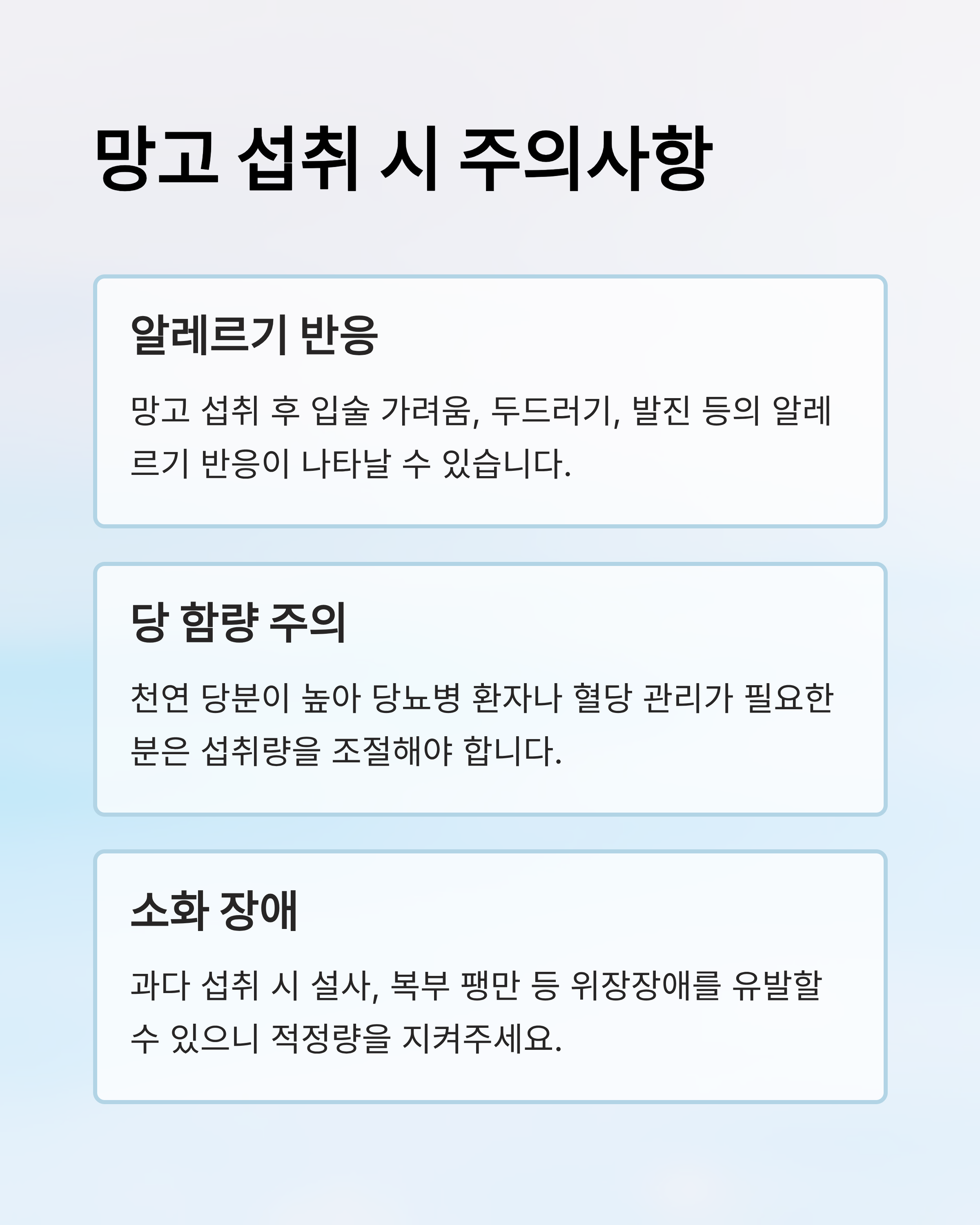 - 당 함량 주의: 망고는 천연 당분이 높아 당뇨병 환자나 혈당 관리가 필요한 분은 섭취량을 조절해야 합니다.