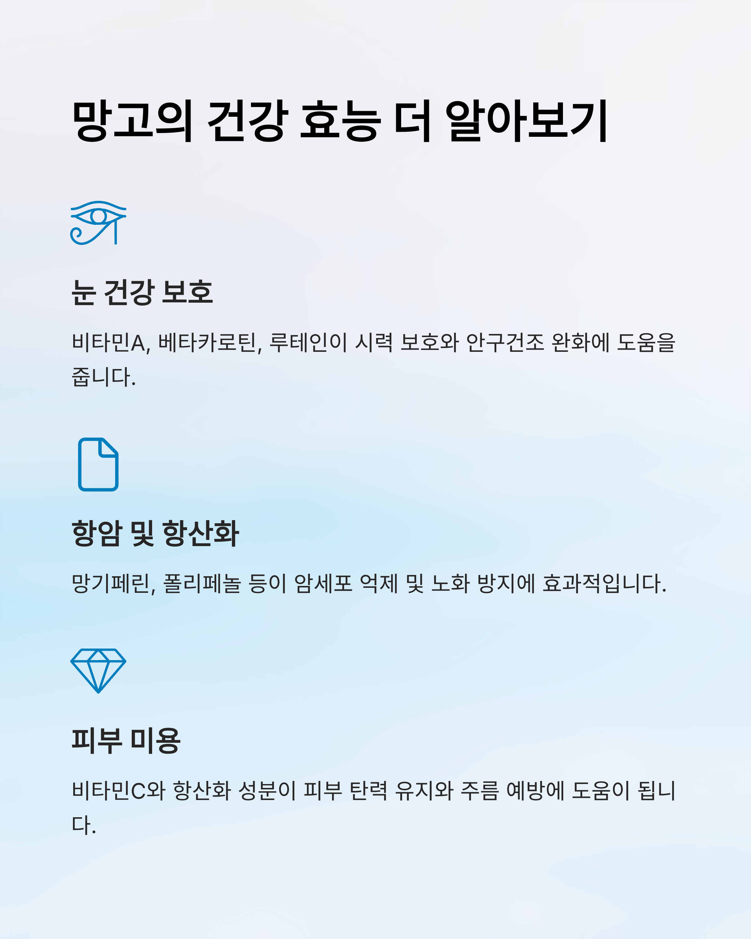 비타민A, 베타카로틴, 루테인, 제아잔틴 등 항산화 성분이 풍부해 시력 보호와 안구건조 완화에 도움을 줍니다.
