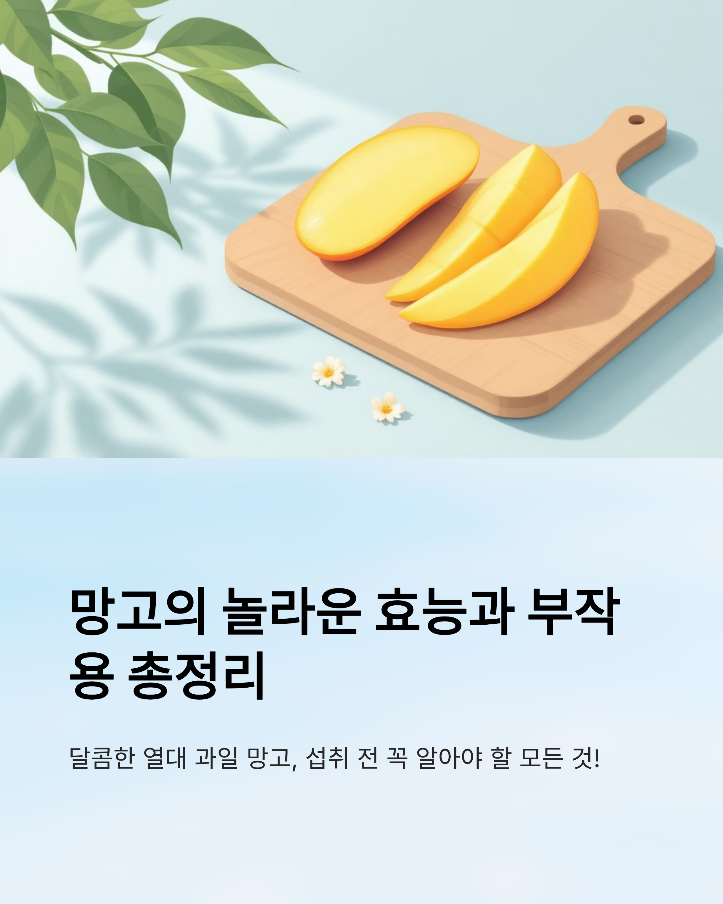 망고는 면역력 강화, 장 건강, 피부 미용, 항산화 효과 등 다양한 건강 효능을 가진 과일입니다. 하지만 알레르기 반응과 당 섭취 과잉에 주의해야 하며, 적당한 양을 꾸준히 섭취하는 것이 핵심입니다.