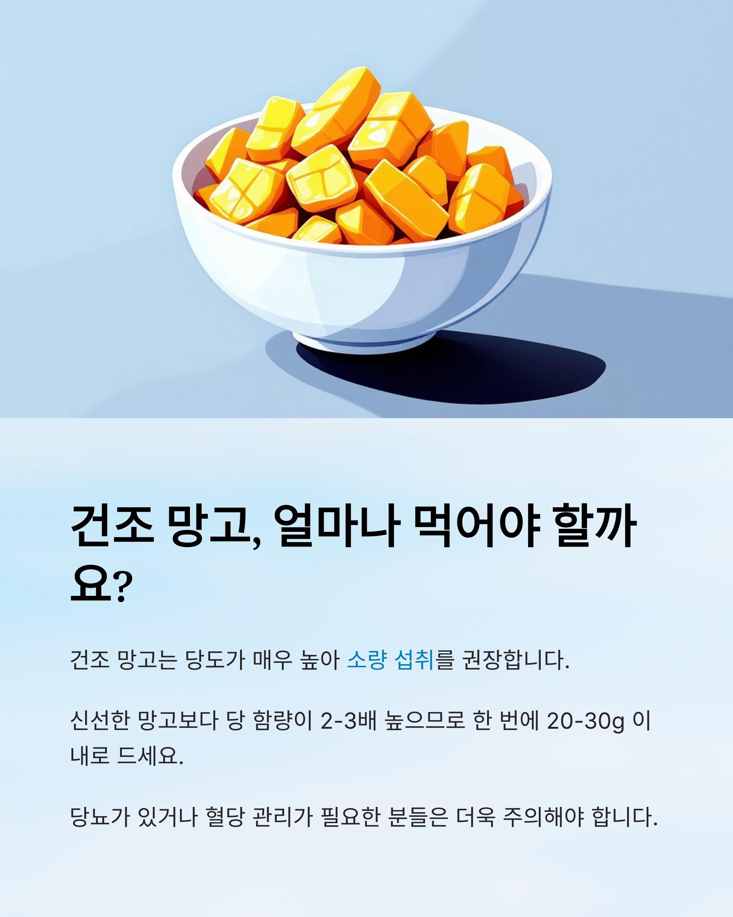 - 건조 망고: 당도가 높아 소량 섭취 권장. 당 함량이 높은 편입니다.
