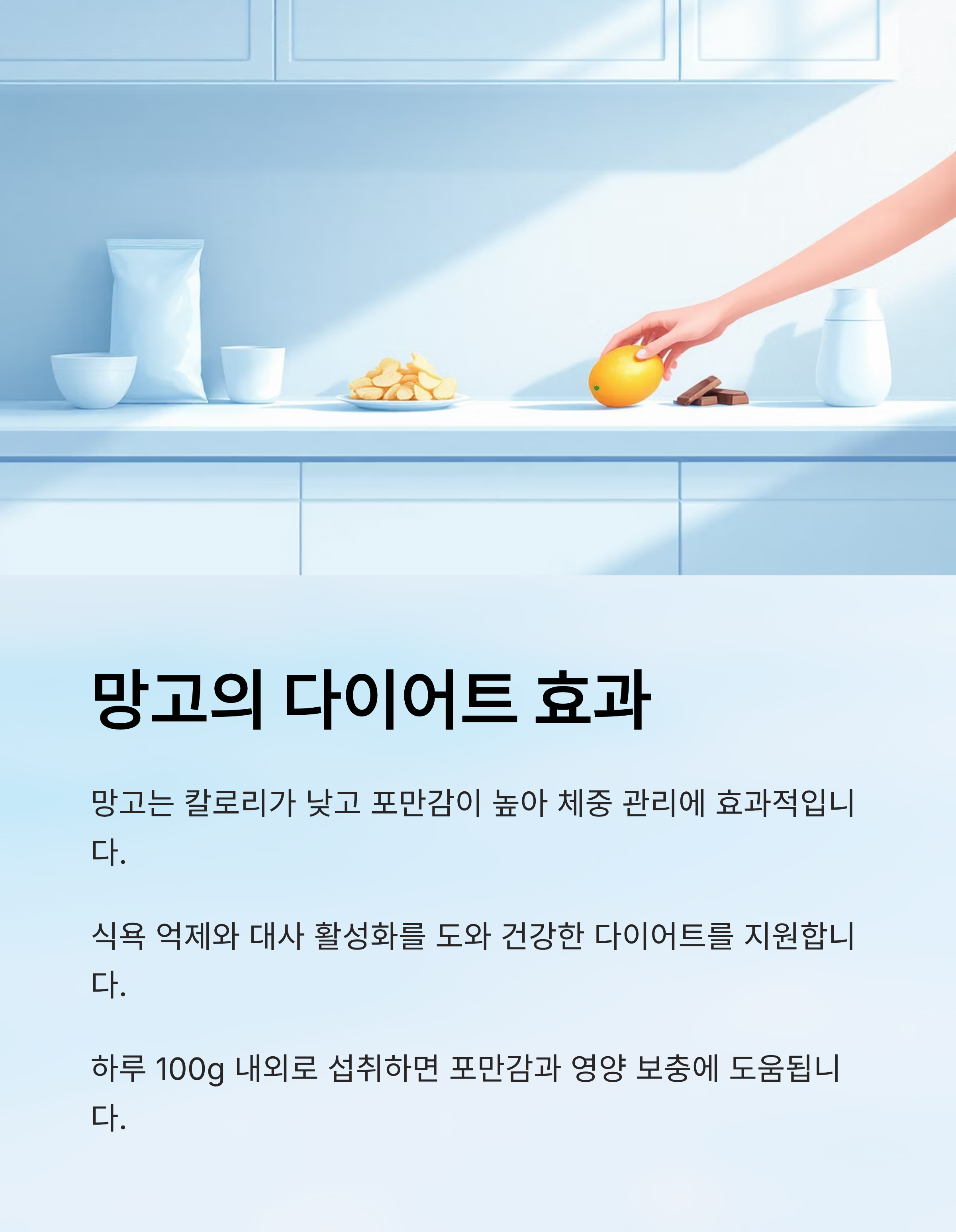 망고는 칼로리가 낮고 포만감이 높아 체중 관리에 효과적입니다. 식욕 억제와 대사 활성화를 도와줍니다.