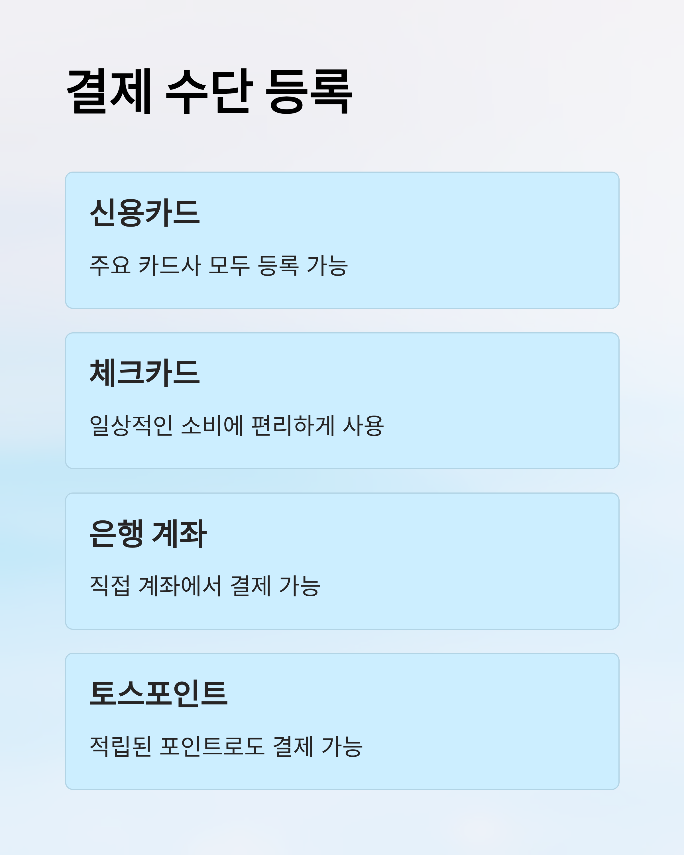 - 결제 수단 등록: 신용카드, 체크카드, 은행 계좌, 토스포인트 가능