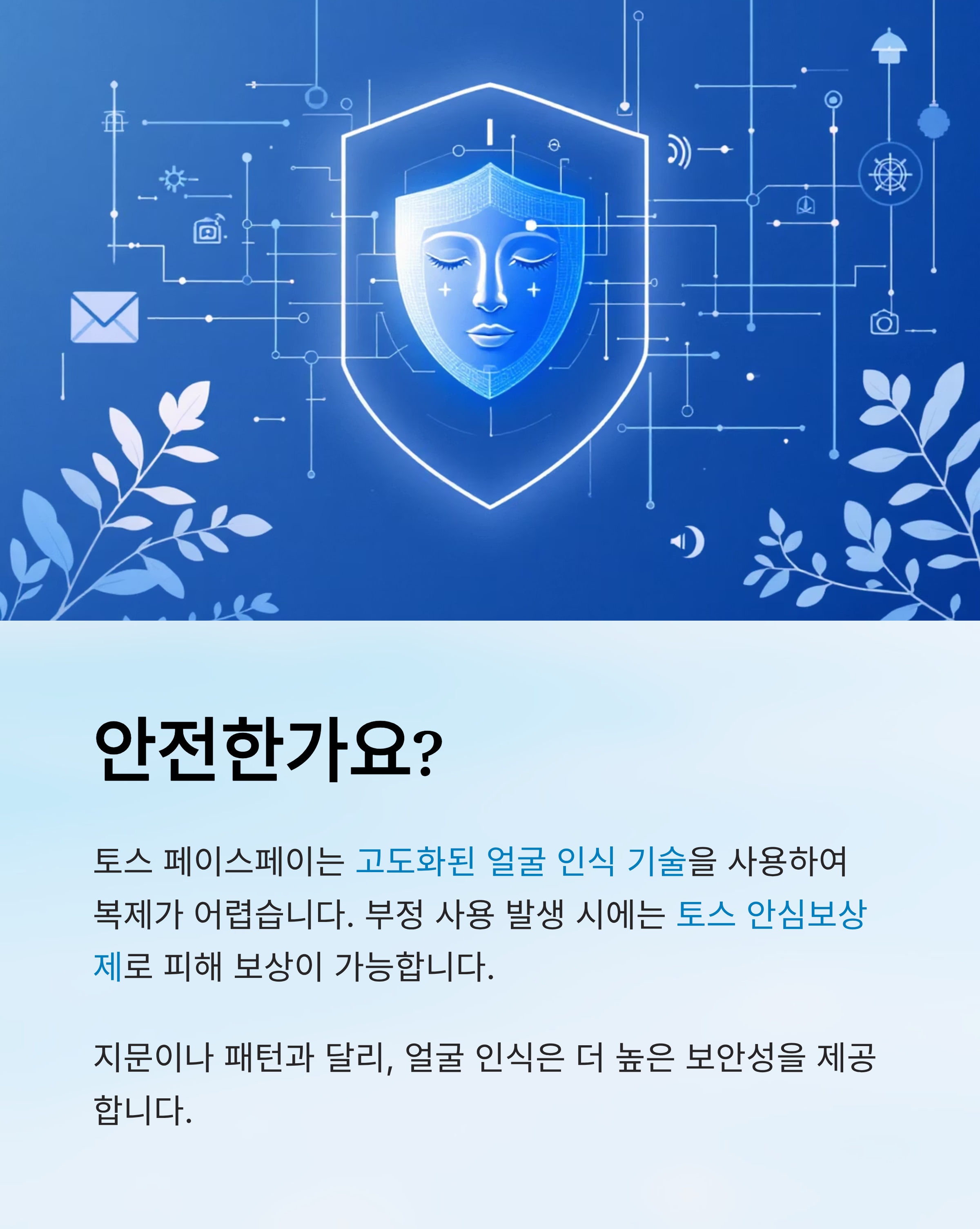 A4. 지문이나 패턴과 달리, 복제가 어려운 얼굴 인식 기술을 사용하며, 부정 사용 발생 시 안심보상제도 운영됩니다.