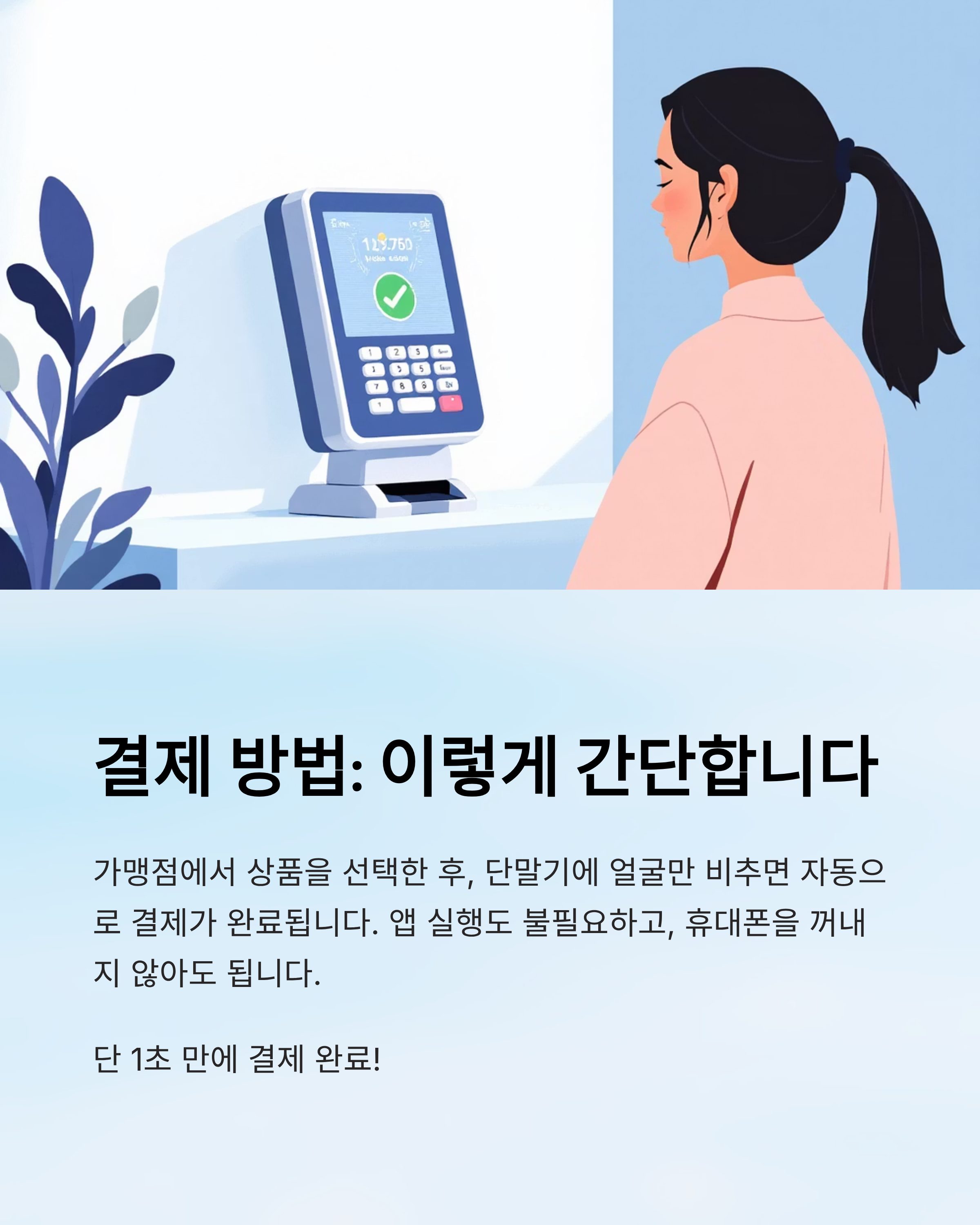이후 등록이 완료되면, 가맹점 전용 단말기에서 얼굴 인식만으로 결제가 가능해집니다.