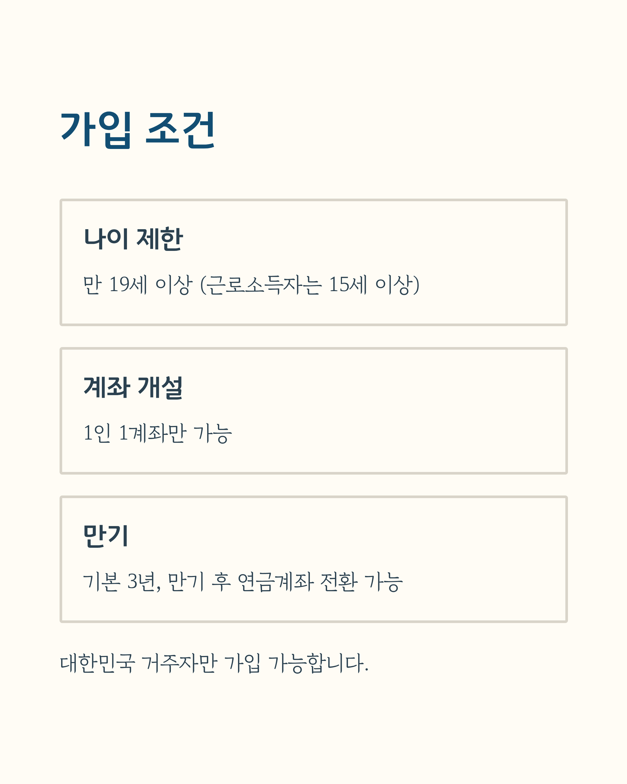 - 가입 조건: 대한민국 거주자 중 만 19세 이상(근로소득자는 15세 이상)