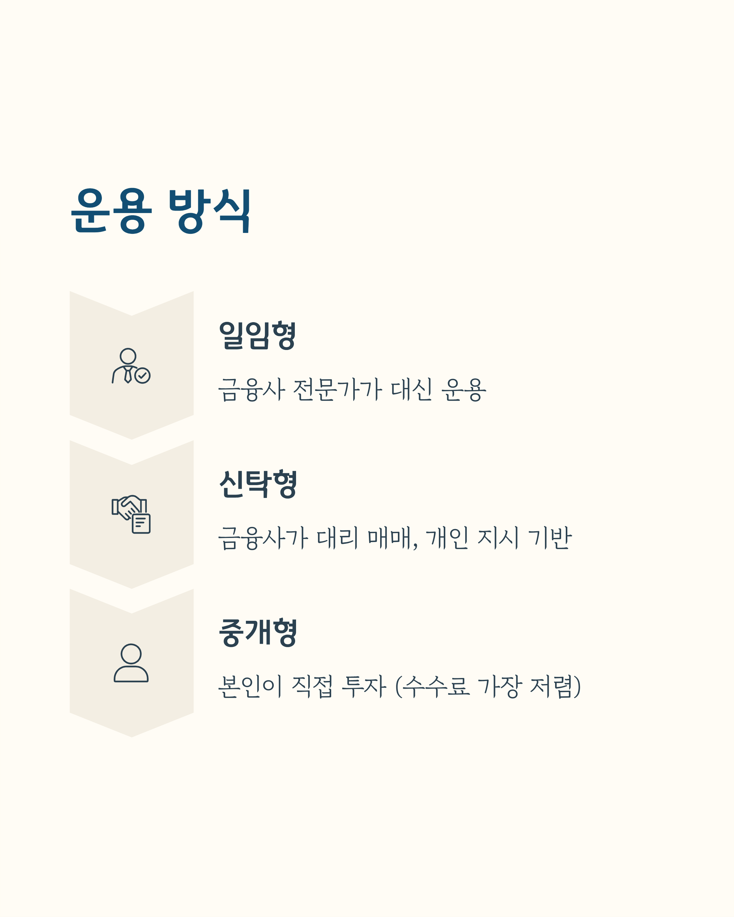- 신탁형: 금융사가 대리 매매, 개인 지시 기반